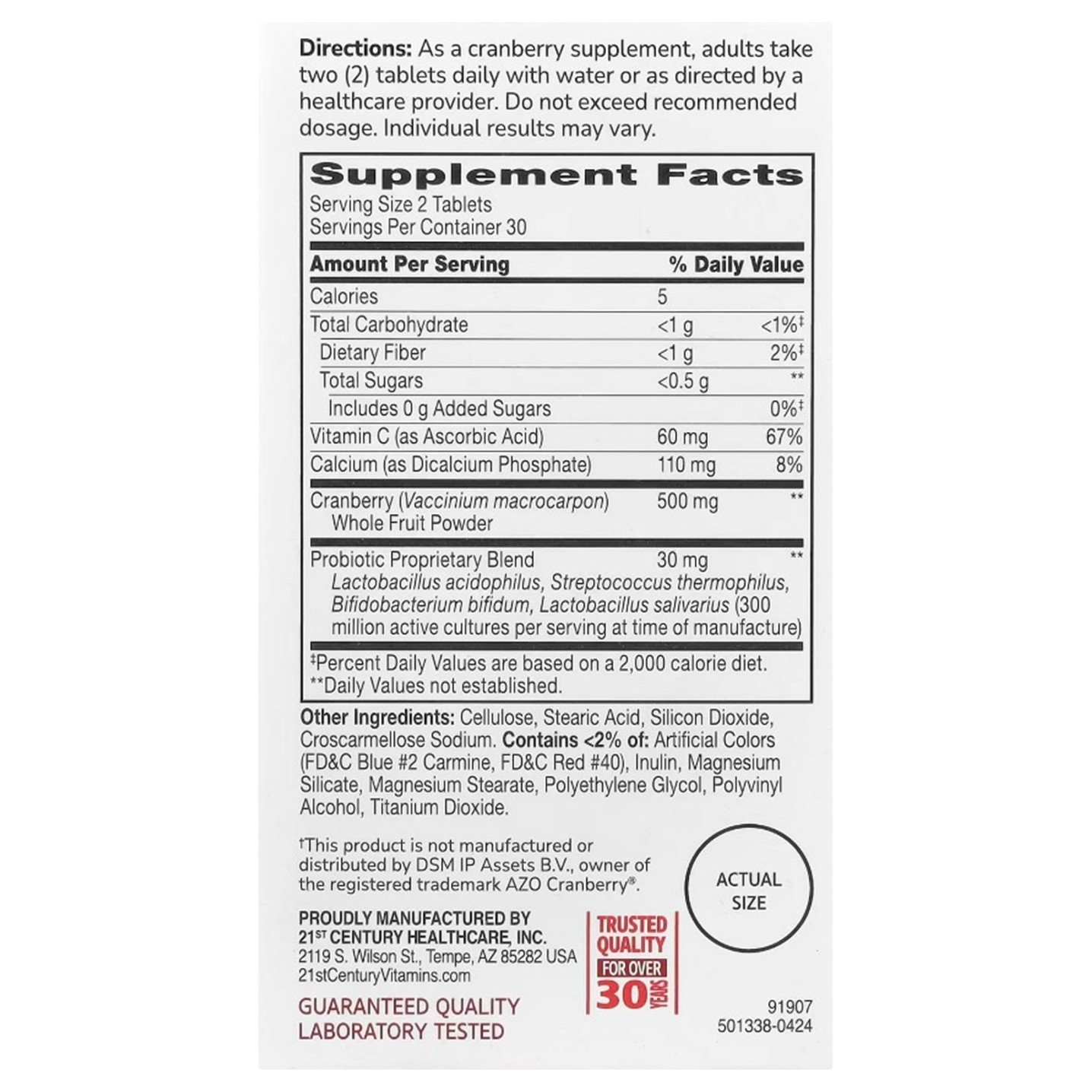 Each serving of 21ST Century Cranberry Plus Probiotic is equivalent to 1 glass of cranberry juice, providing you with the goodness of cranberry’s natural urinary tract support in 2 convenient tablets.