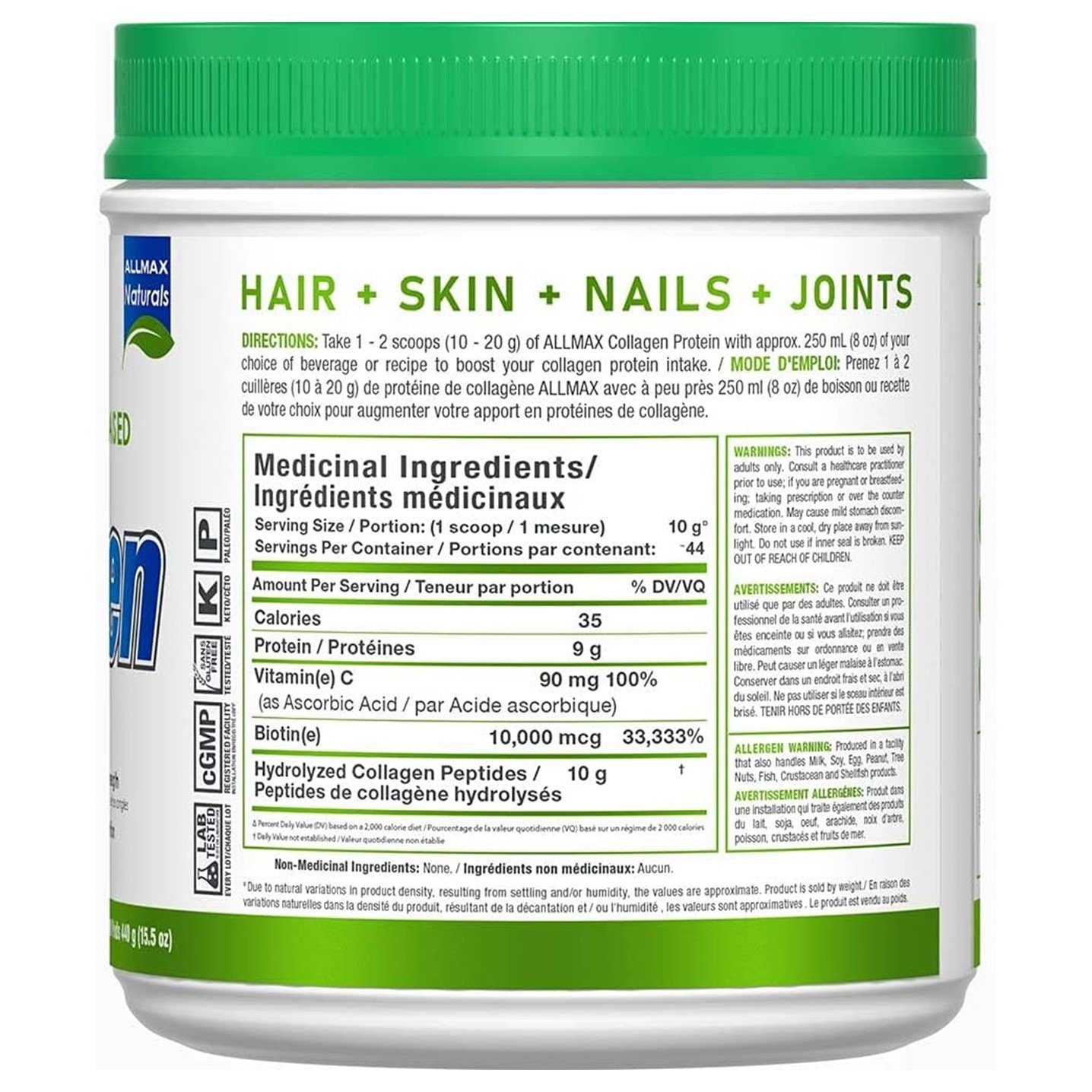ALLMAX Grass Fed and Pasture Raised Collagen Protein is derived from Hydrolyzed Collagen Protein Peptides (Types I, II & III). Collagen is essential for production of connective tissue and provides support for healthy joints, hair, nails and skin. ALLMAX Collagen also has the added benefit of Biotin for extra support in the formation of healthy hair, nails, and skin and Vitamin C as a source of antioxidants.