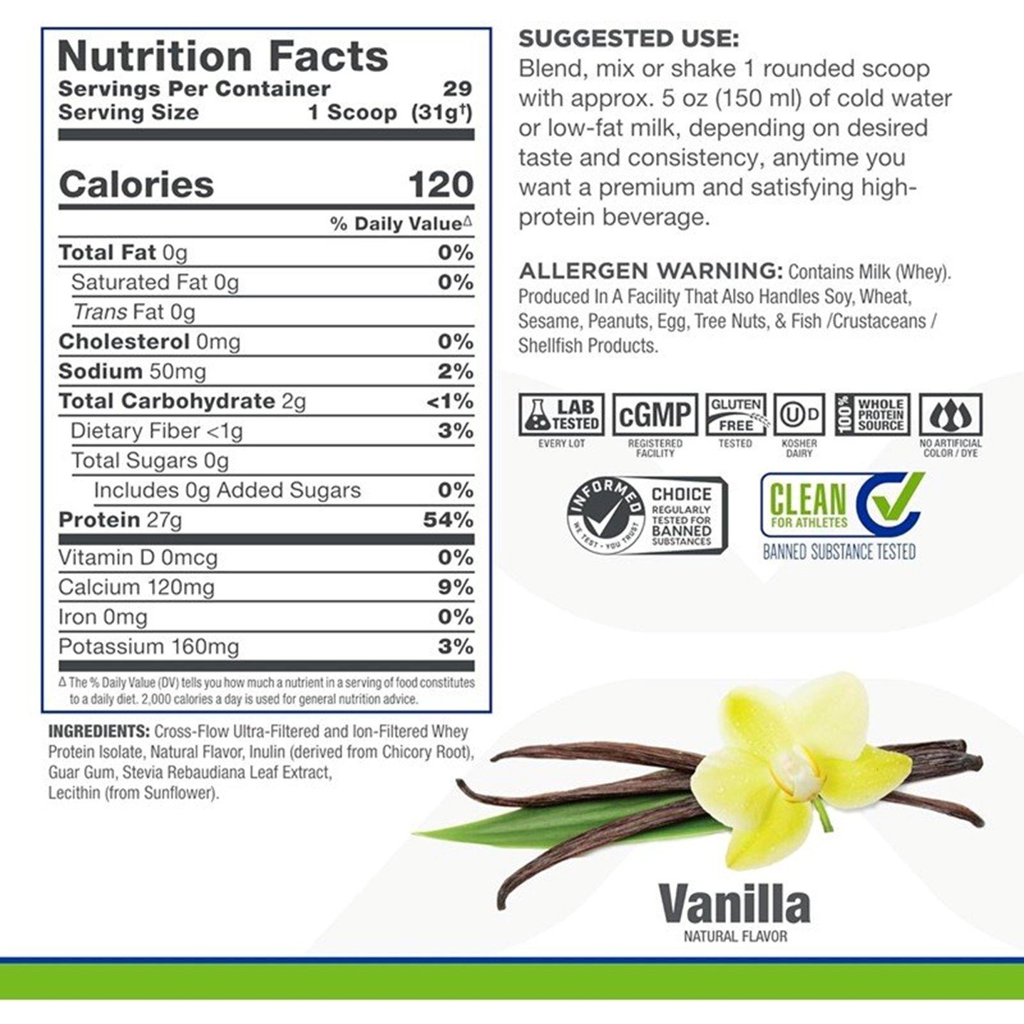 Cross-flow ultra-filtered and ion-filtered whey protein isolate, lecithin (sunflower).