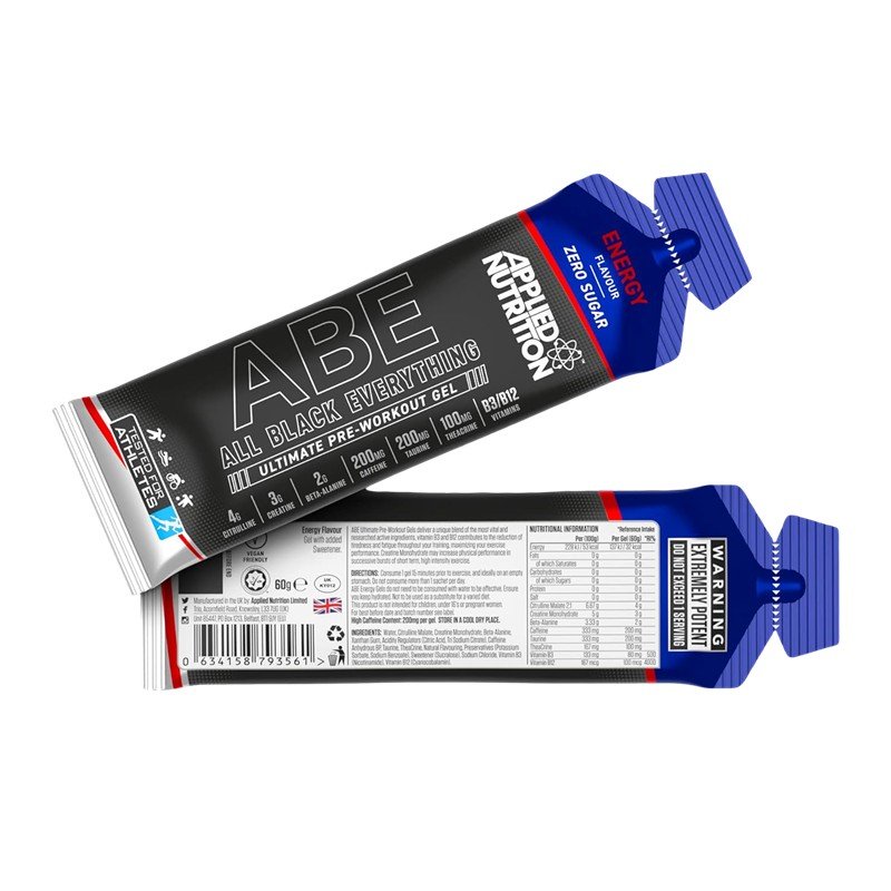 ABE Ultimate Pre-Workout Gels deliver a unique blend of the most vital and researched active ingredients, vitamin B3 and B12 contribute to the reduction of tiredness and fatigue throughout your training, maximizing your exercise performance. Breathe Easy formula is added to increase oxygen intake during exercise. Creatine Monohydrate may increase physical performance in successive bursts of short-term, high-intensity exercise.