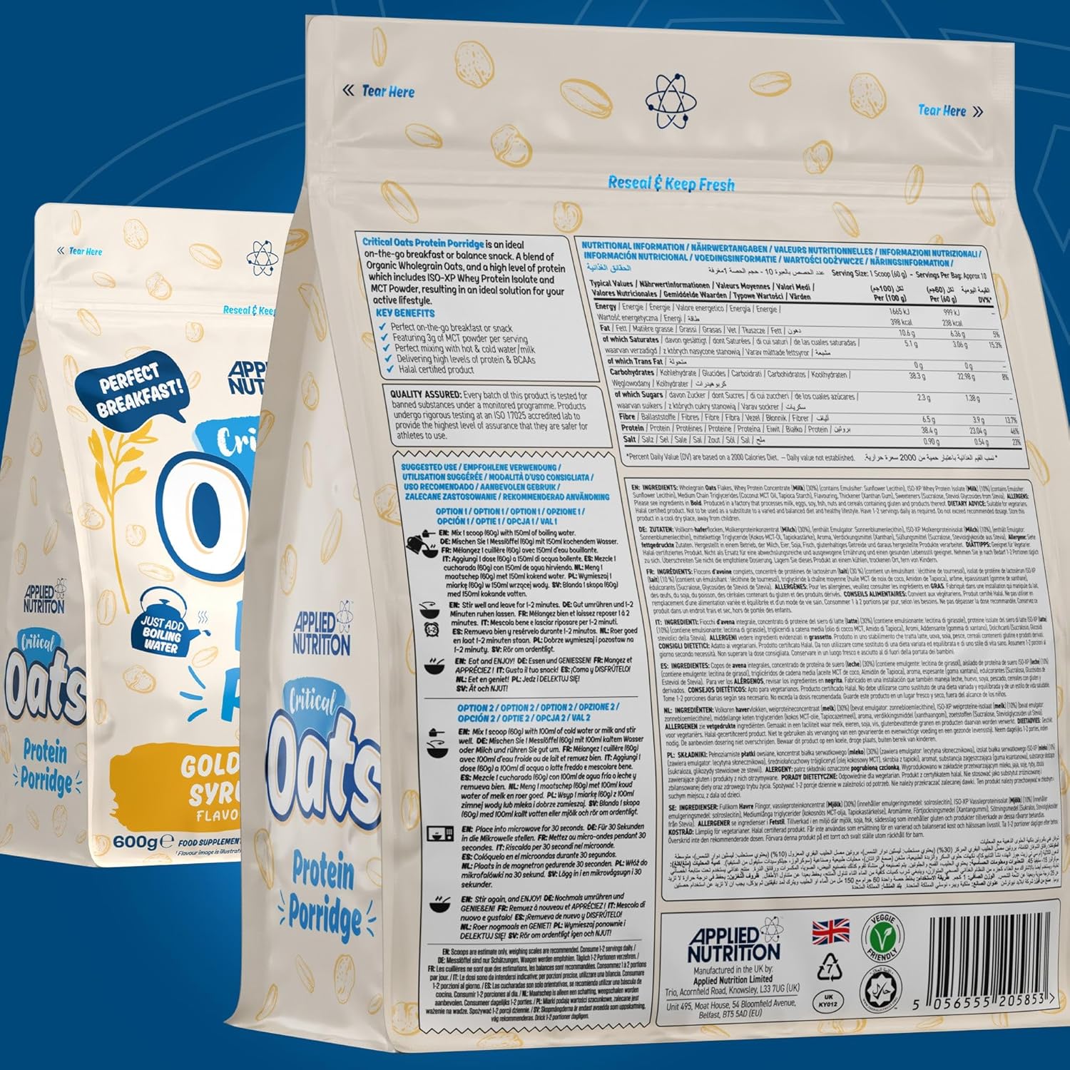 Applied Nutrition Critical Oats Protein Porridge is Oats Protein Vital Oats Organic Whole Oats + Whey Protein (Whey Protein) from Brandblade Nutrition International is a premium quality protein primarily because it contains 23 grams of whey protein and is fortified with muscle-building amino acids. It can be used as a delicious breakfast or as a snack between main meals. A healthy, satisfying, delicious, and integrated meal that is beneficial to the body and is very important, especially during periods of diet for everyone who suffers from hunger, which causes diet failure and cannot be dispensed with by bodybuilders. Mix it with hot or cold milk or water.