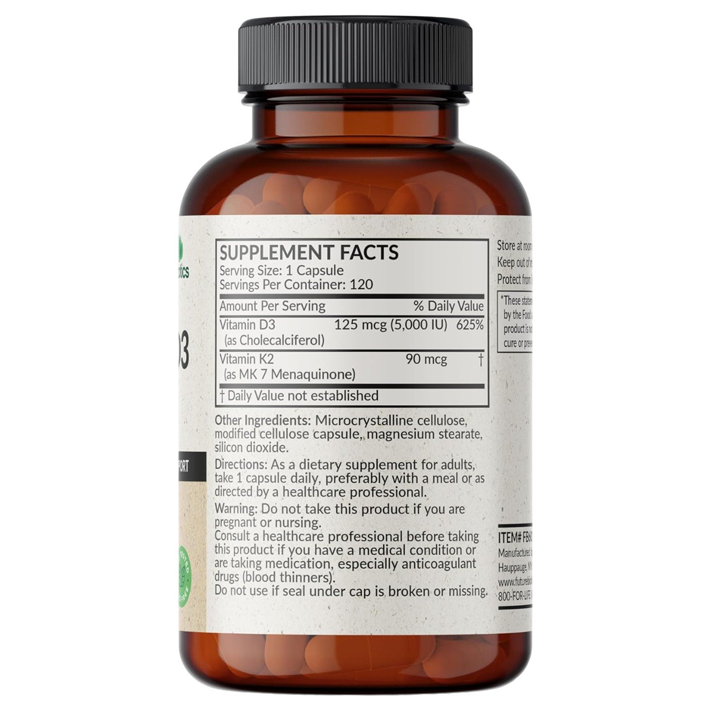 Futurebiotics Vitamins K2 + D3 supplies the perfect match. While the benefits of Vitamin D are well known, many don’t realize that Vitamin D needs Vitamin K2 to maximize its benefits. This formula helps the proper absorption of calcium with D3, while providing the correct distribution to your bones where you need it most. Futurebiotics K2 + D3 are truly the perfect pair for healthy bone & heart support.