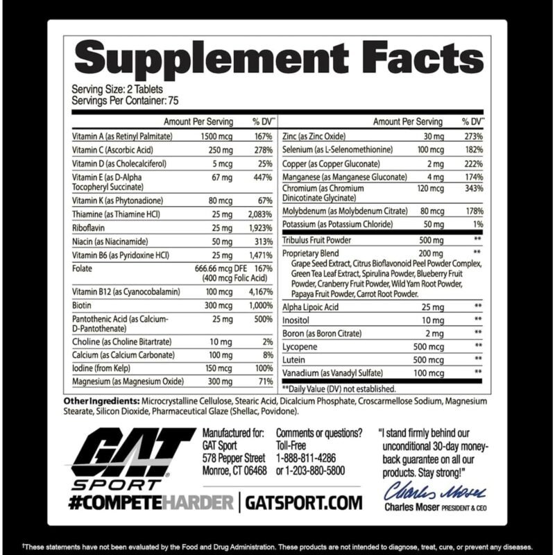 Mens Multi+Test is a complete vitamin, mineral and energy multivitamin with added men’s virility ingredient Tribulus Terristis. GAT Mens Multi offers athletes complete support for nutrient deficiencies they may need with an added virility and testosterone boost.