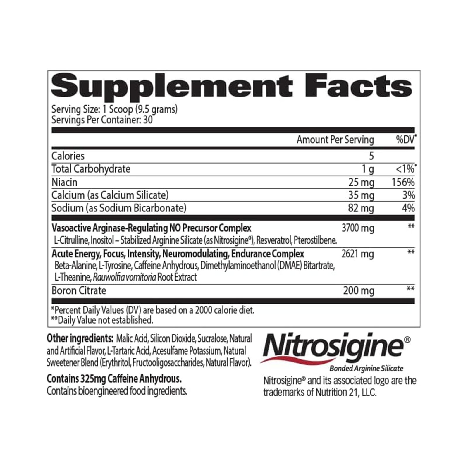 Note: One serving contains 325 mg Caffeine, 1000 mg of Nitrosigine, and a clinically researched dose of Boron.