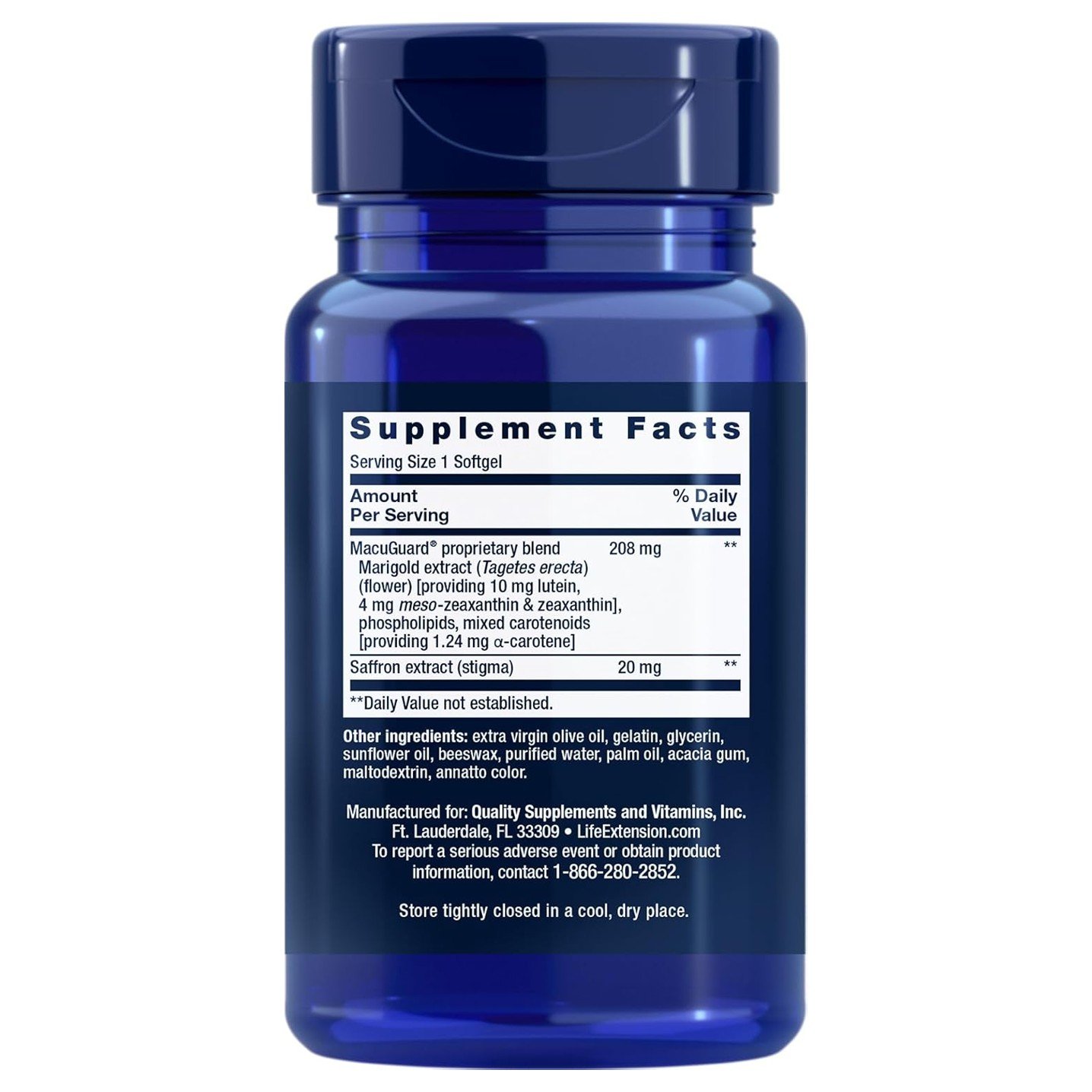 | MacuGuard® Proprietary Blend Marigold extract (Tagetes erecta) (flower) [providing 10 mg lutein, 4 mg meso-zeaxanthin & zeaxanthin], phospholipids, mixed carotenoids [providing 1.24 mg α-carotene] | 208 mg | ** |