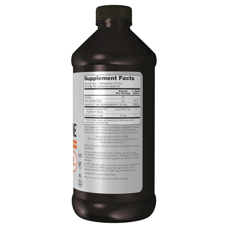 Now Triple Strength L-Carnitine Liquid has three times the L-Carnitine (3,000 mg per tablespoon) as in our regular strength product (1,000 mg per tablespoon).