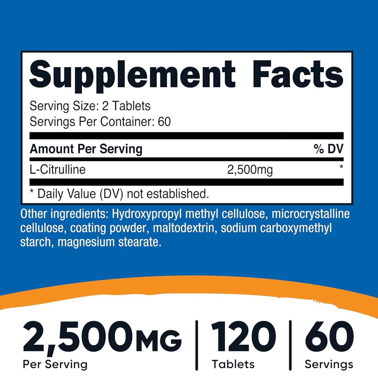 Nutricost L-Citrulline tablets contain 2.5 grams (2500mg) of L-Citrulline in every serving. Each batch is tested by independent, ISO-accredited laboratories to insure safety and quality.