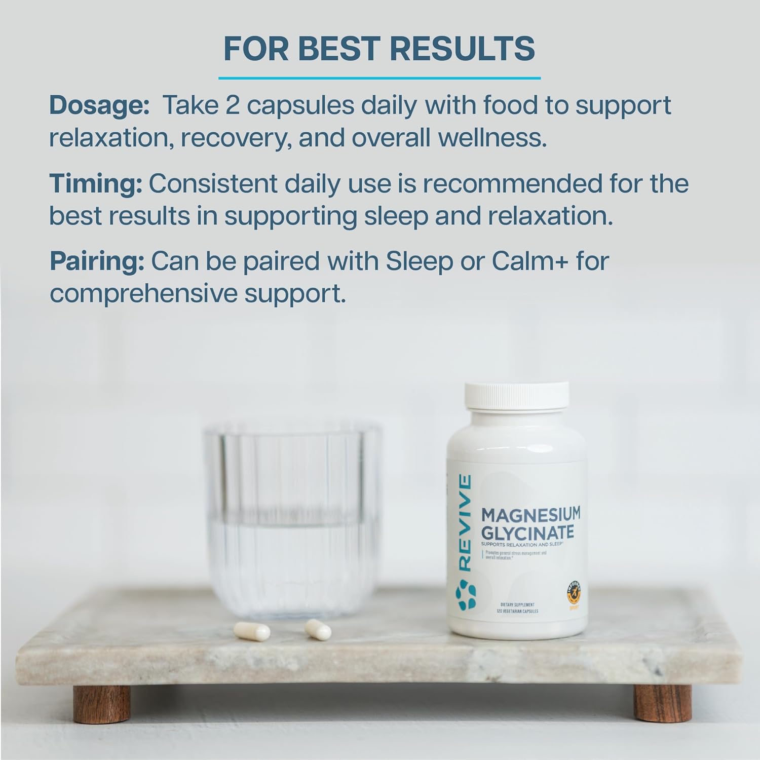 A – The RDA for elemental magnesium is 400 mg for an adult. 4 capsules of Revive’s magnesium glycinate would yield 400 mg of elemental magnesium.