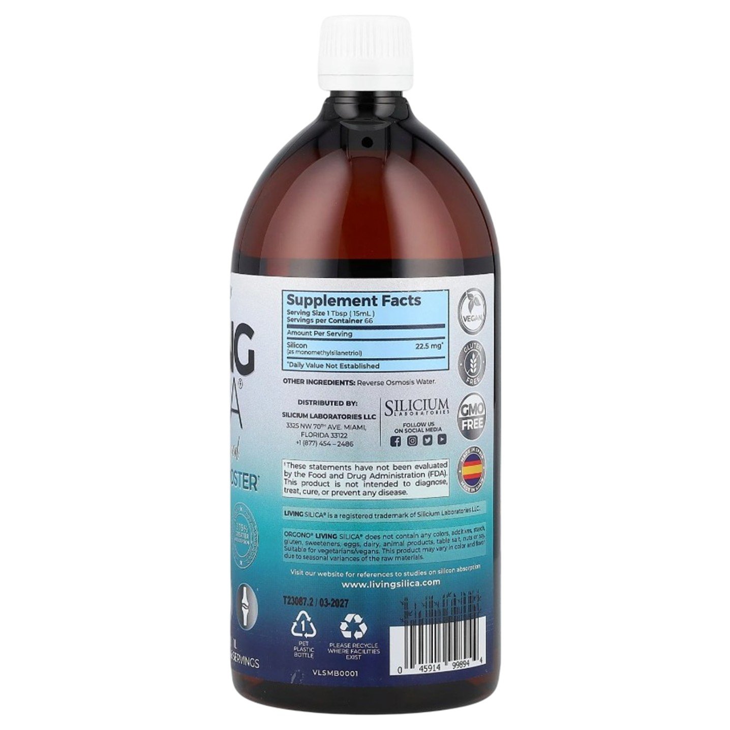 Orgono Living Silica does not contain any colors, additives, starch, gluten, sweeteners, eggs, dairy, animal products, table salt, nuts or soy.