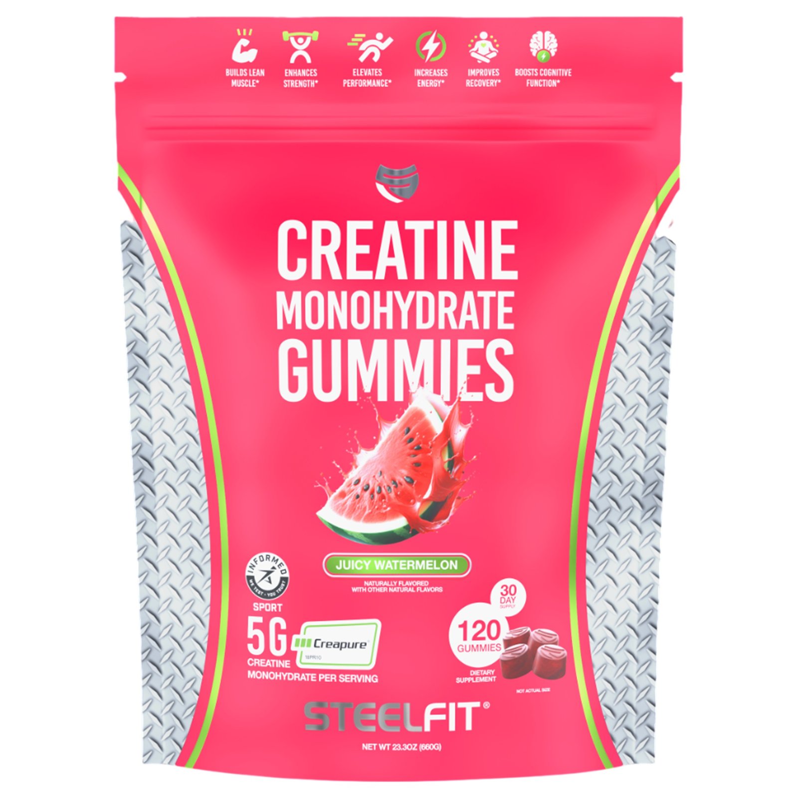 Elevate your workouts with SteelFit creatine monohydrate gummies! Each serving delivers 5g of Creapure creatine monohydrate – The most researched and trusted form of creatine. your fitness journey just got a whole lot tastier!