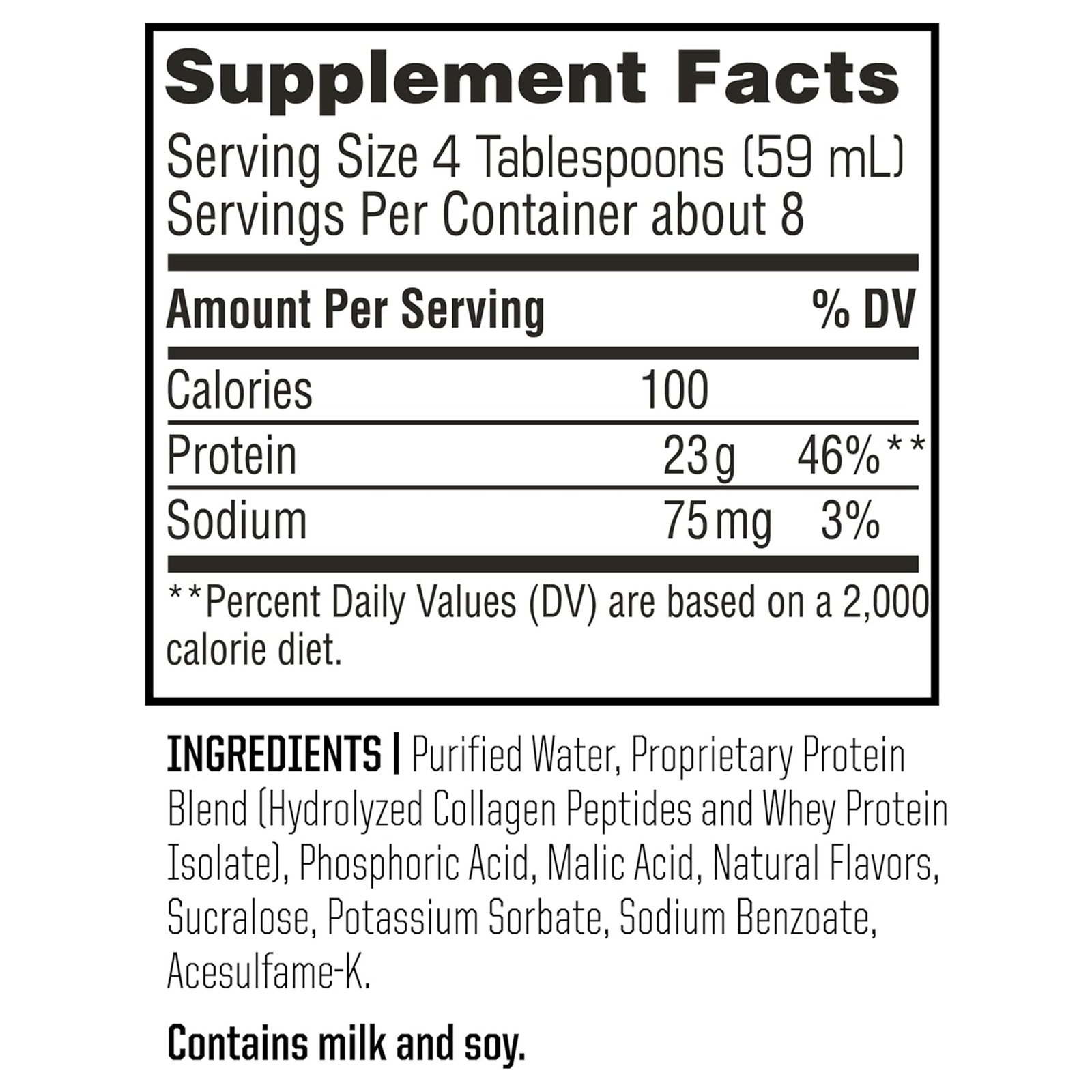Purified water, proprietary protein blend (hydrolyzed collagen peptides and whey protein isolate), phosphoric acid, malic acid, natural flavors, sucralose, potassium sorbate, sodium benzoate, acesulfame-K.